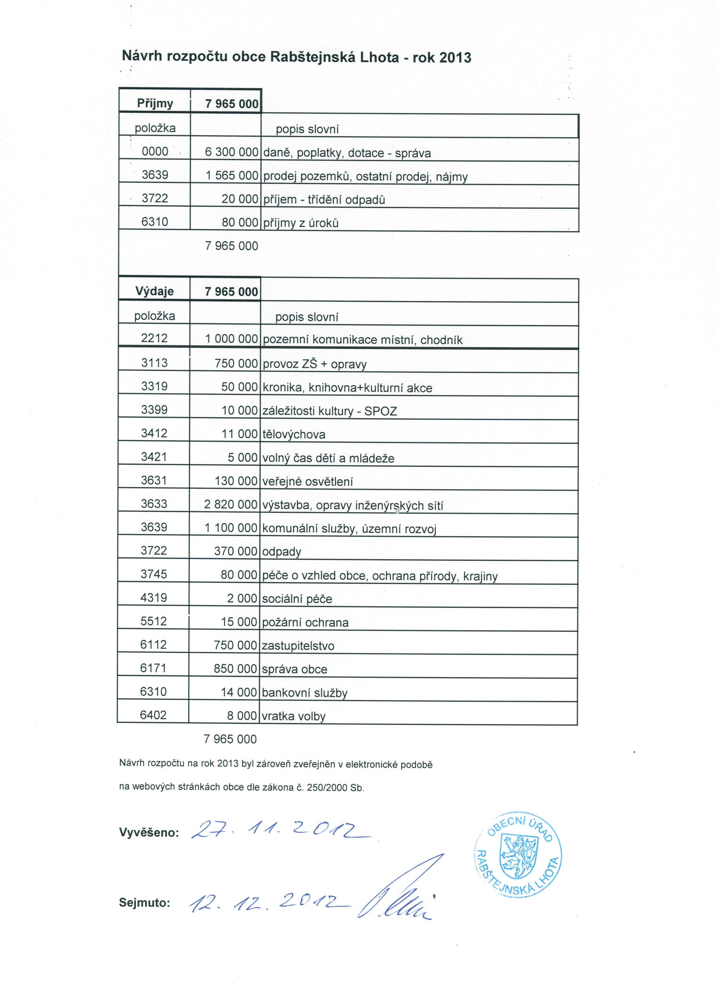 | Návrh rozpočtu obce na rok 2013-zde | 27.11.2012 | 12.12.2012 |