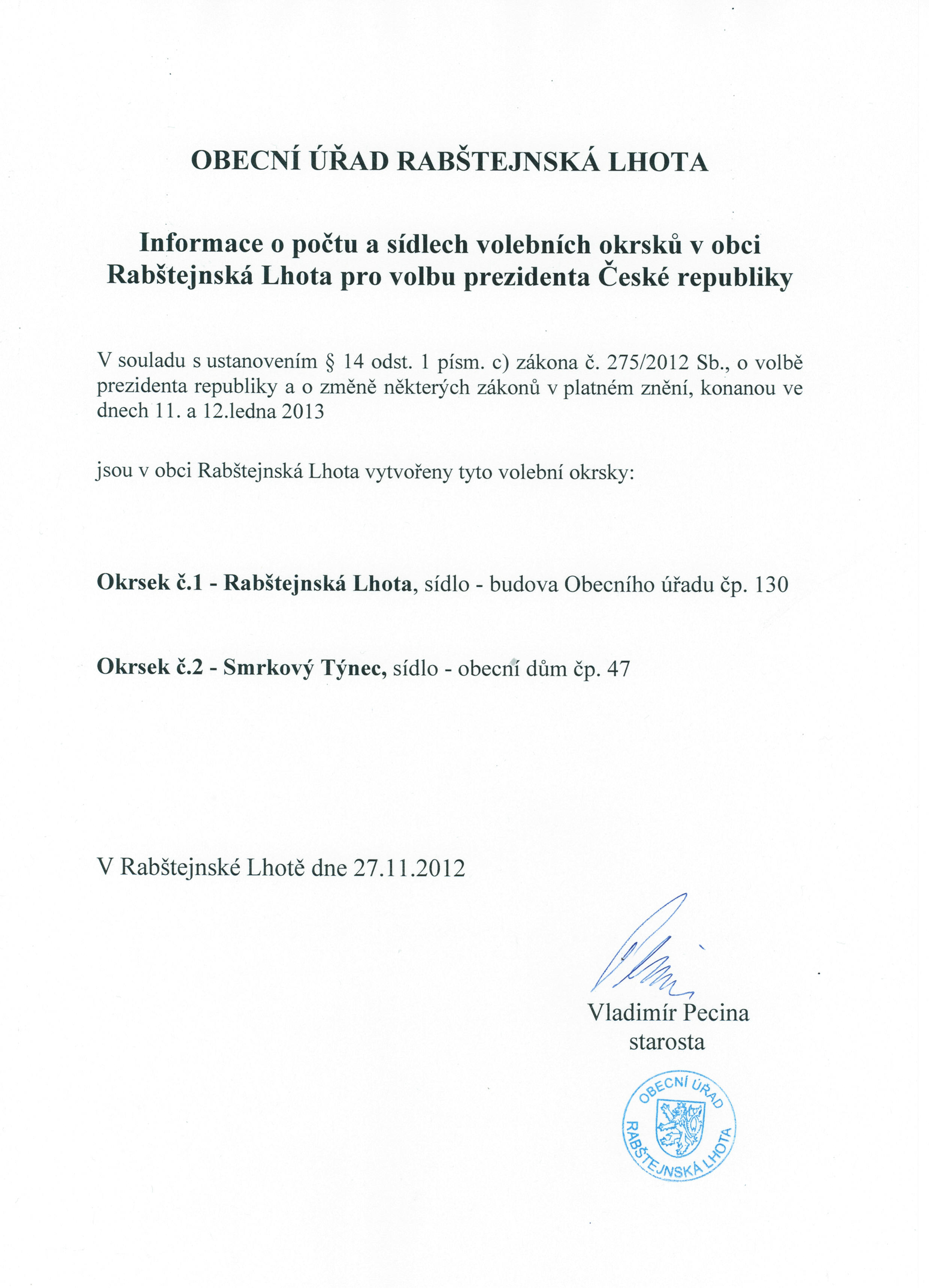 | Volba prezidenta-info o počtu a sídle volebních okrsků-zde | 27.11.2012 | |